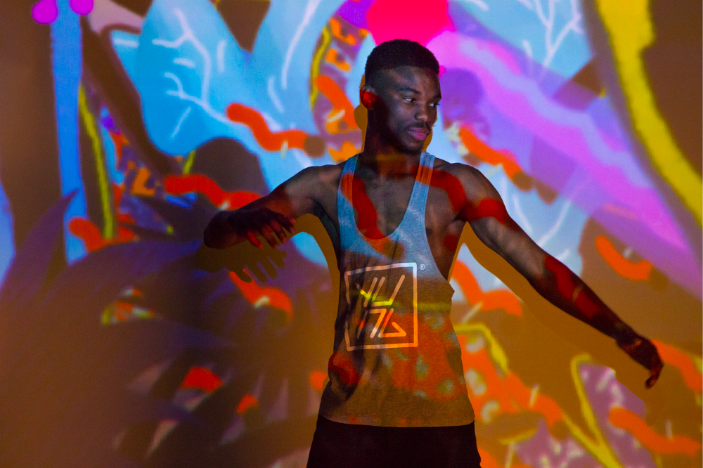 I’ve always been interested in fashion. I was a fashion lecturer and I had a fashion label in Topshop. Yung Club is all of my talents and skills brought into one pot and I wanted to do the experiences first. Fashion is such a competitive industry now, especially when you’re dealing with fast fashion at such low prices. I thought it was better to develop an experience first with the fashion retail on the back of that experience. You’ve got outfits that go with the experiences. The projections from the space are printed on to the activewear and it’s very colourful. Kind of inspired by the United Colors of Benetton from the 1980s. It ties in with the themes of the experiences which are sea, wild, space and city.